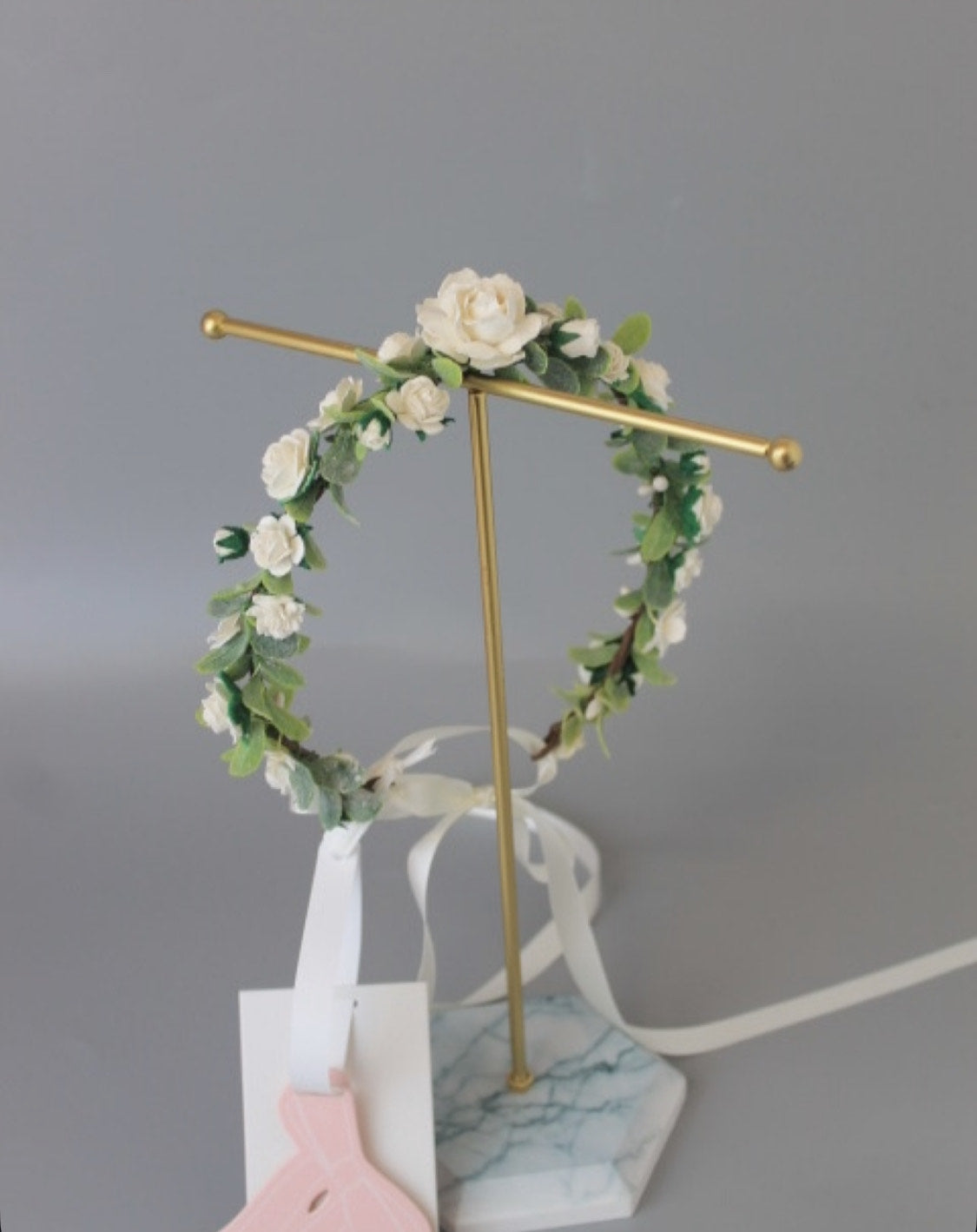 Flower crown, featuring a delightful mix of ivory flowers in all sizes, carefully arranged on a bed of lush green leaves. This Flower crown is designed with the utmost care for your little lady's comfort, tied to the back with an ivory ribbon.