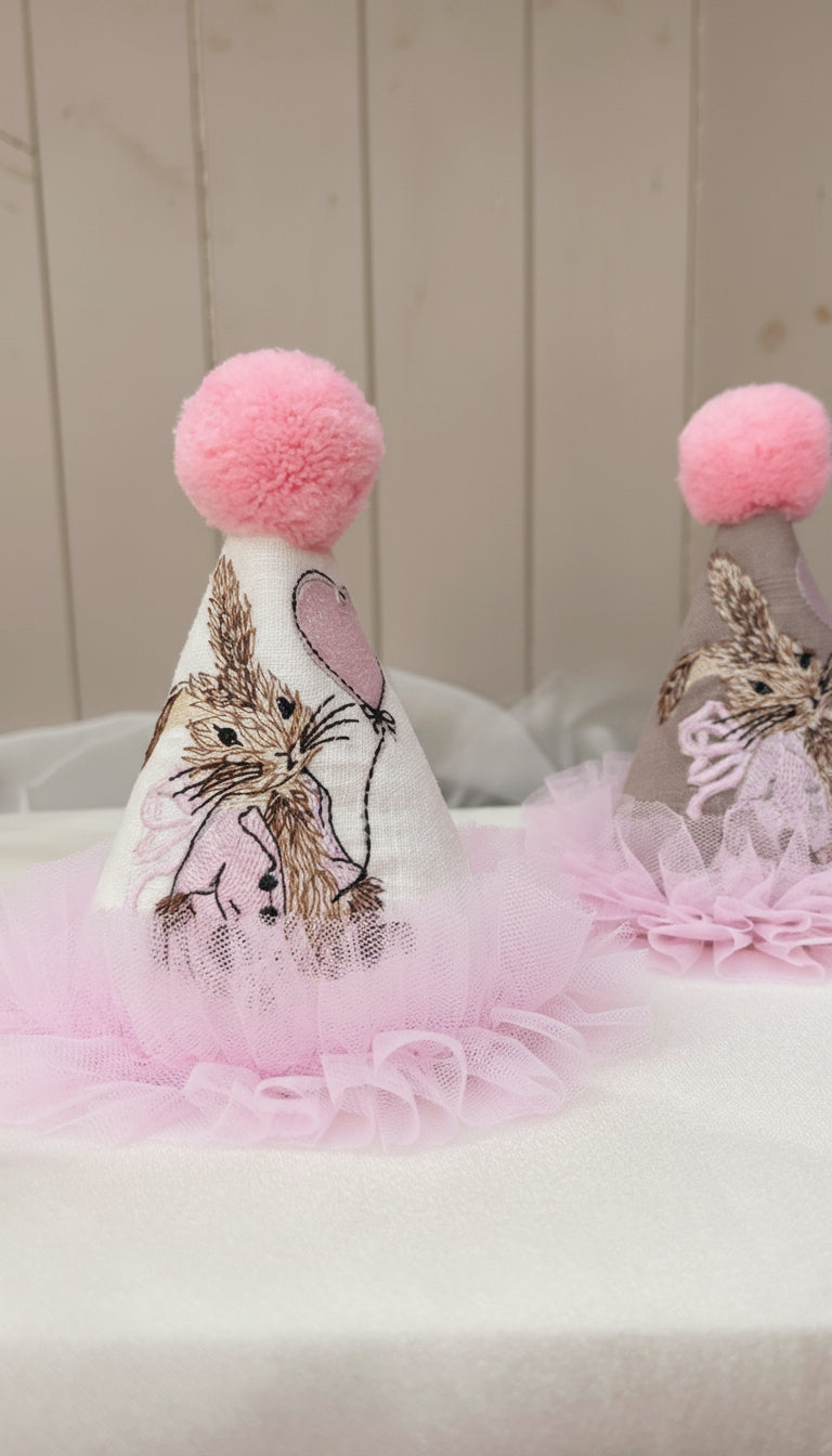 Celebrate your little one’s special day with our charming Rabbit Party Hat, lovingly handmade in Ireland. Available in two soft linen bases — white linen or grey linen — both designs feature the same adorable embroidery: a beige and brown rabbit wearing a pink jacket, complete with a pink bow and a pink balloon for a festive touch.